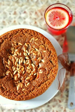 Start with preheating your oven to 180 degrees celcius. Soak the tabolueh in some hot milk for 5-7 mins, just till it softens half way.Drain out the excess milk if there is some. Don’t want to make it too soft or u’ll have mush in the cake, and we are looking for a wonderful firm bite-able texture. Leaving the last two ingredients mix everything else in a large bowl with a wooden spoon. Mix well and let it rest for about 5 mins and the pour into a cake tin. Evenly sprinkle the fig slices and pinenuts all over the top and bake at 180 degrees celcius for 40 mins or till knife come out clean. This will definately vary as my oven is kinda conked to watch your cake and check it after 30 mins.