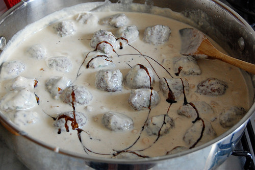 Paul, of course, suggested that we go all out for this version, and as a result this is an incredibly complicated dish as I've made it. I made the lamb stock from scratch, cooked the chickpeas from dried, harvested citrus from the yard, and made the kibbeh meatballs by hand. (Hey, there's not a lot going on in Algeria!) However you should know that it is very easy to make several shortcuts, described below, and have this on the table for a relatively easy (easier?) dinner. Homemade lamb stock is great, but the dish will still be good if you don't have it. There is something amazing about the tahini-citrus sauce that is warm and comforting and reminds me of really good gravy but without the heaviness.