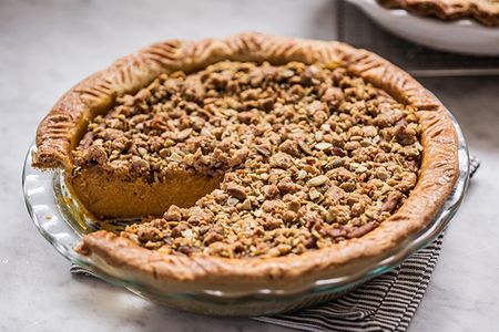 4. Meanwhile, back to the lamb: Strain the lamb stock and set aside in the refrigerator. Shred any of the lamb meat from the bones and place in a small bowl. Add the pine nts and seasoning to the shredded lamb meat and set aside.